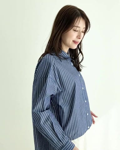 上のボタンを開けて華奢なネックレスを合わせるのも◎