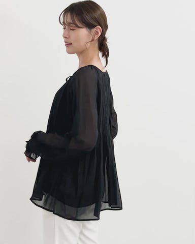 ノーカラーで広めに開いた首元が華奢な印象をプラスし、程よく透けるシアー素材が抜け感を演出。