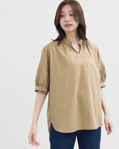 小ぶりのスタンドカラーと程よい丸みのある袖パフ感で女性らしさのある一枚です。