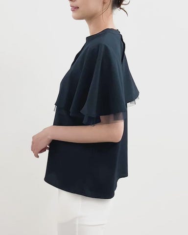 バンドカラーとケープデザインが特徴的なこのブラウスは、シンプルでありながらも存在感抜群。