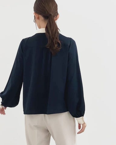 ・首元のギャザーが、ふんわりとした女性らしいシルエットを演出。