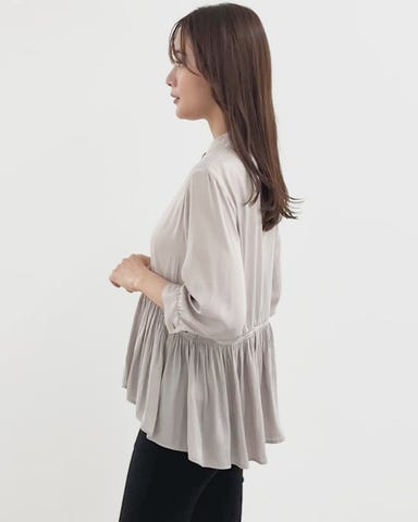 ・胸下すぐの位置に施されたギャザー切り替えが、ふんわりとしたペプラムシルエットを形成。