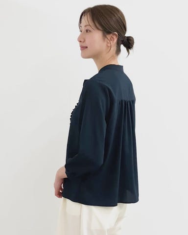 ・フロントに施された繊細なフリルデザインが印象的なジョーゼットブラウス。