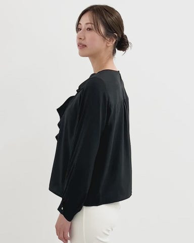 ・首元に施されたドレープとゴールドのリングが、顔まわりに華やかさと品格を添える、ボウタイブラウス。
