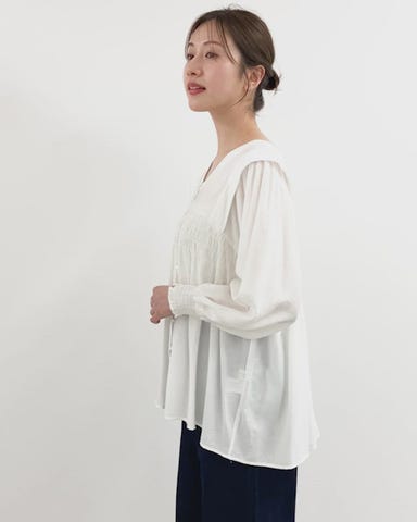 ・胸元にシャーリングデザインで立体感のある表情のブラウス。