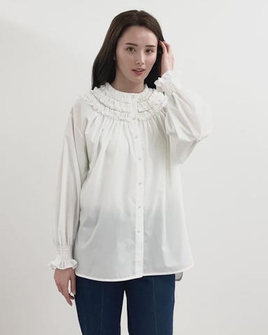 フロントのパールボタンや袖口のシャーリングが女性らしい着こなしを叶えます。
