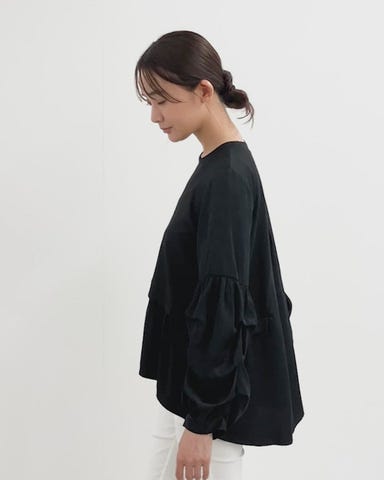 ・ ふんわりとしたボリューム袖とレイヤード風デザインが魅力のトップス。