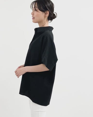 ・深めのVネック風フロントと開襟デザインが、抜け感のある大人のスタイルを演出。