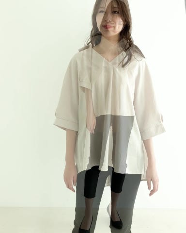 落ち感のある薄手の柔らかな素材感で、体のラインも拾いにくいにもポイントです。