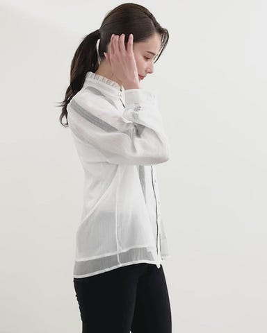 スタンドカラーにフリルが施されており可愛らしさをプラスします。