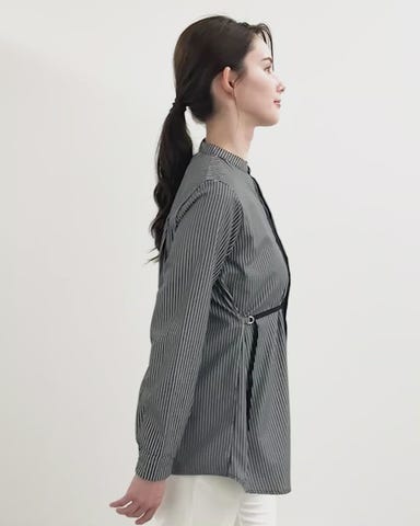ノーカラーの首元やボタン部分の比翼仕様でスッキリと着用でき、バランスのとれた一枚です。