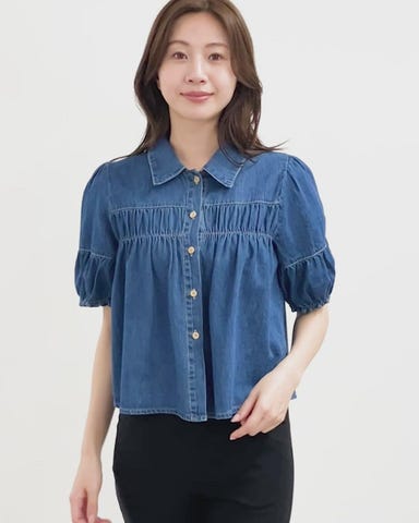 バストラインにシャーリングが寄せられ、ふんわりとしたシルエットなのが女性らしいポイントに。