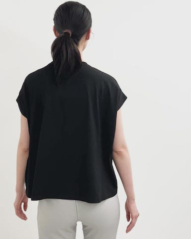 ゆったりとしたワイドシルエットに、肩まで隠れるコンパクトなフレンチスリーブ型ボディで、適度な抜け感を漂わせる一着。