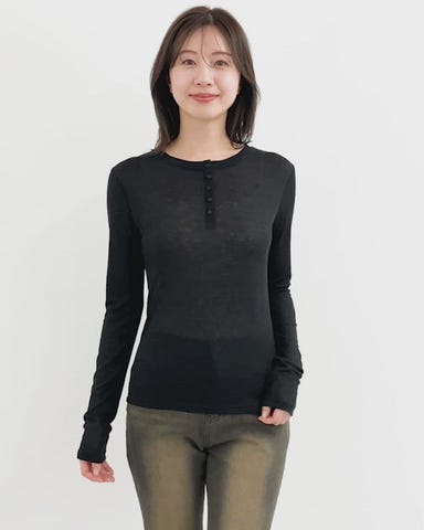 ・洗練されたヘンリーネック:フロントに並んだ小ぶりのボタンが、お顔周りに程よいカジュアルさと抜け感をプラス。ボタンを開けてデコルテを見せる、こなれた着こなしもおすすめです。