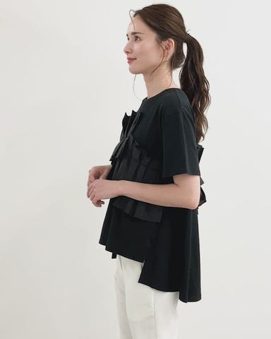 フロントからバックにかけたアシンメトリーなフリルがポイントのTシャツ。