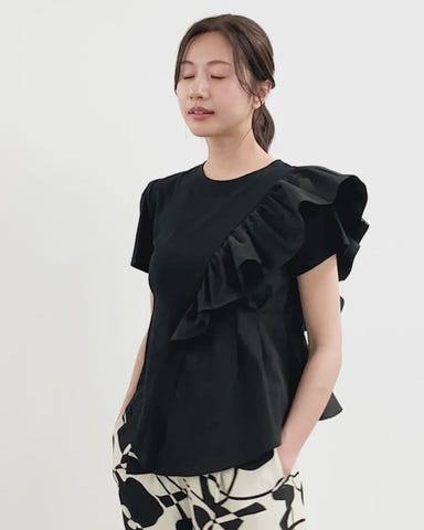 一枚で顔まわりが華やぐ、シンプルなTシャツにラッフルフリルをドッキングさせたトップス。