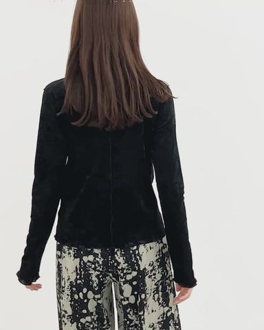 ・首元と袖口にあしらわれた、波打つようなメロウフリルがフェミニンなアクセント。