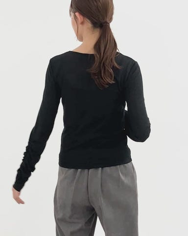 ・首元はクルーネックで、鎖骨を美しく見せ、すっきりとした印象に。