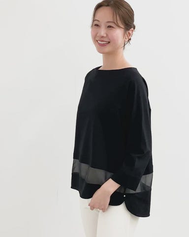 ・裾部分に施されたシアー素材の切り替えがポイントで軽やかさと抜け感を演出します。