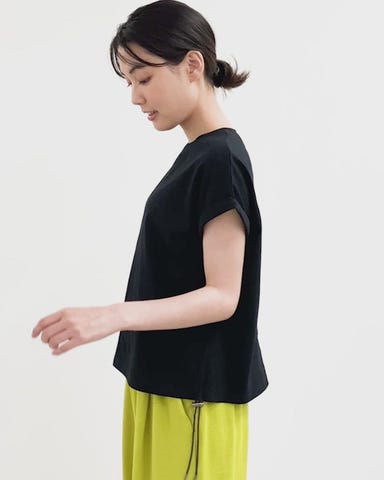 すっきりしたシルエットのTシャツなので、ワイドパンツやフレアスカートなど、