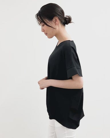 レーヨン混薄手ポンチ使用の裾タケノコタック入りプルオーバー。