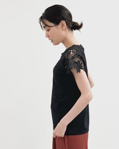 両肩に大きめのスカラップレースが組み合わされた清涼感のあるデザイントップス。