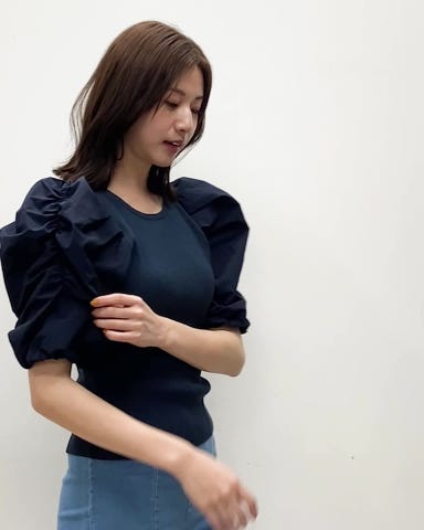 見頃は弾力のあるニット、袖口はゴムでストレスフリーの着心地です。袖はギャザー入りで張りのある生地なのでシルエットが綺麗なパフスリーブ。ボワンとした袖がフェミニンな印象を与えてくれる