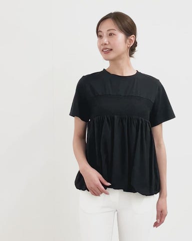 胸元にギャザーを施し裾部分はソフトな質感の素材を使用することで、