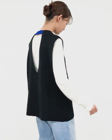 ・アシンメトリーに切り替えられたネックラインの配色が、モダンで遊び心のあるアクセント。
