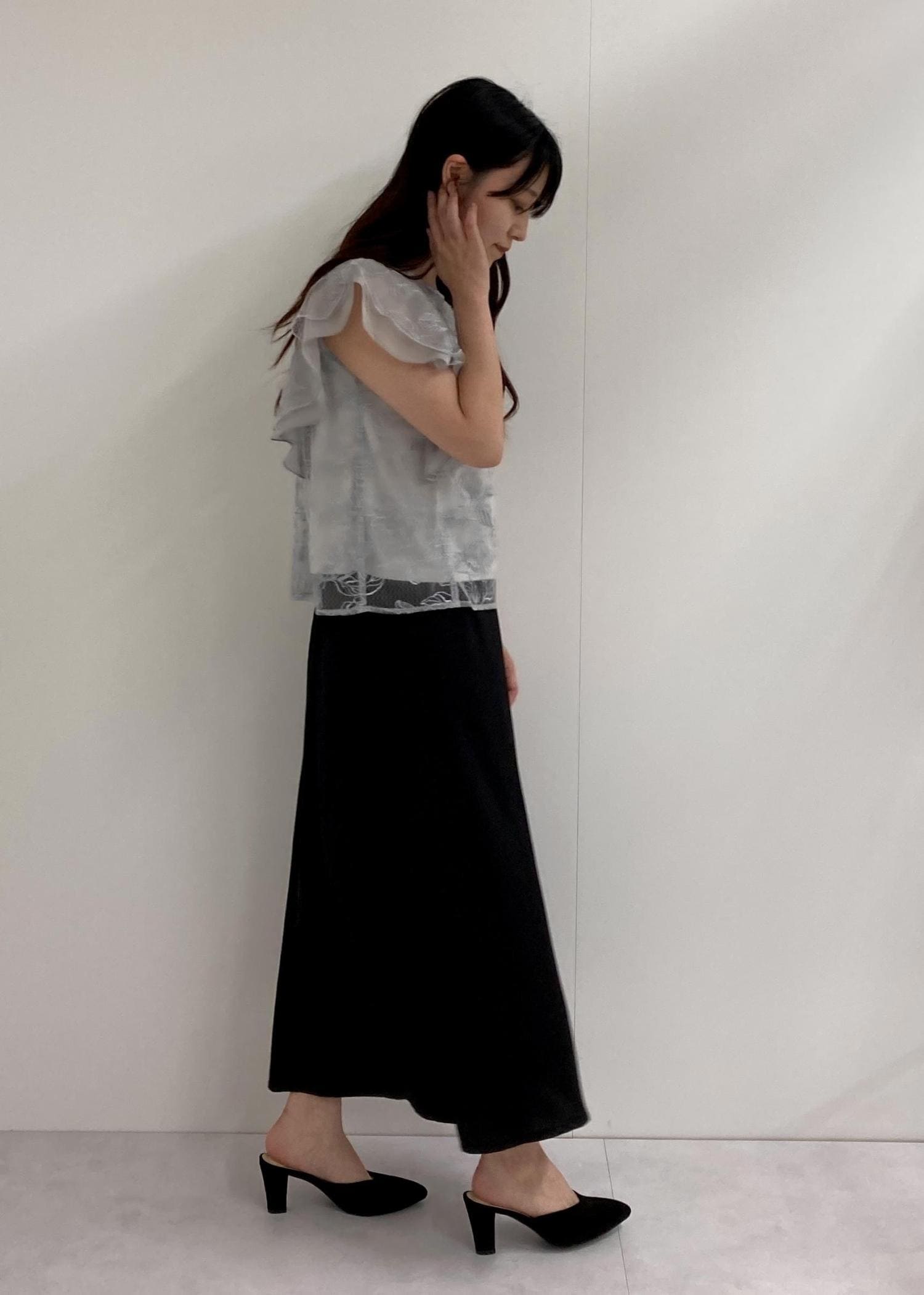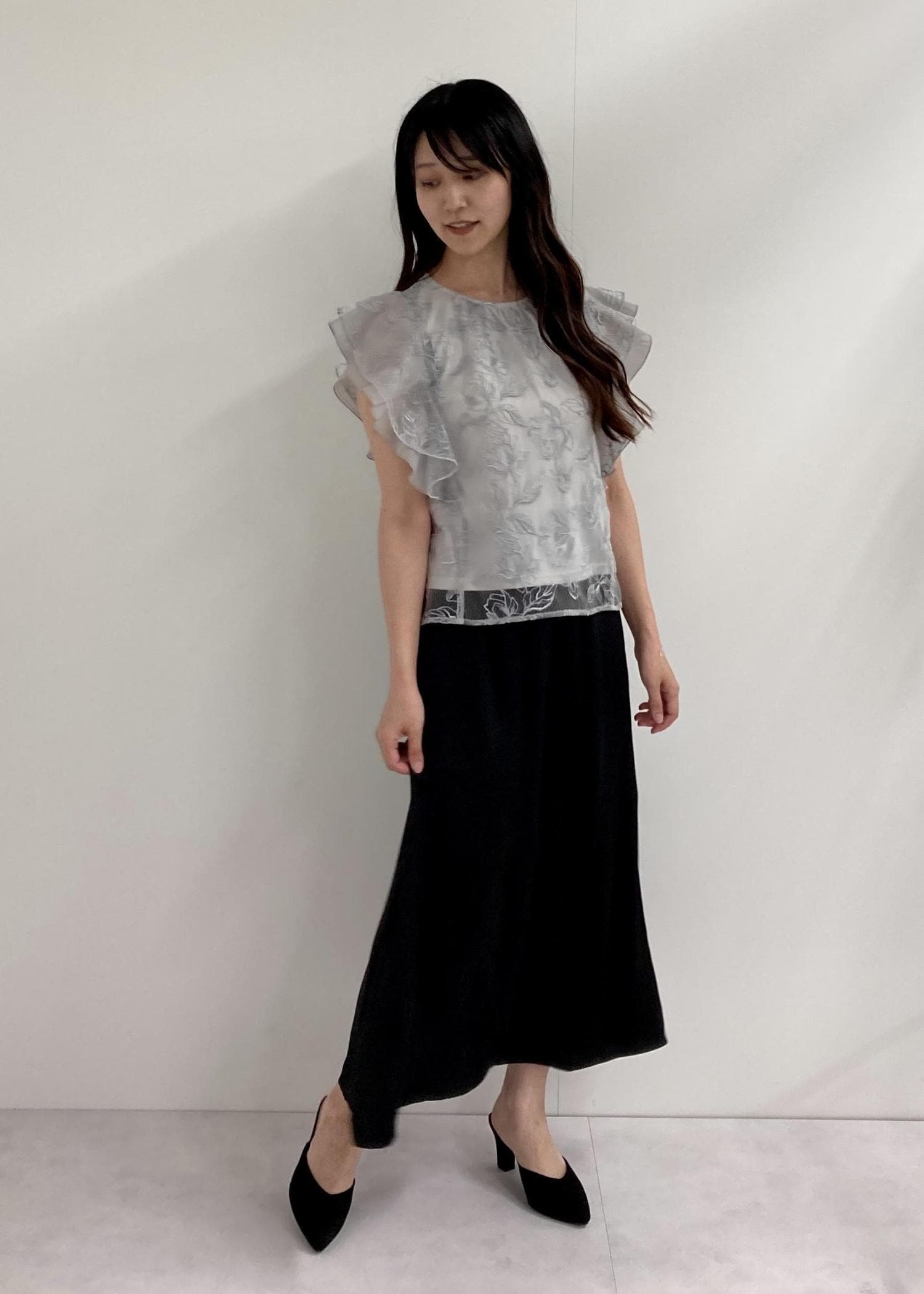 フェミニンなブラウスに、ナロースカートで落ち着きをプラスしました。大人女子にぴったりなコーディネートです♪