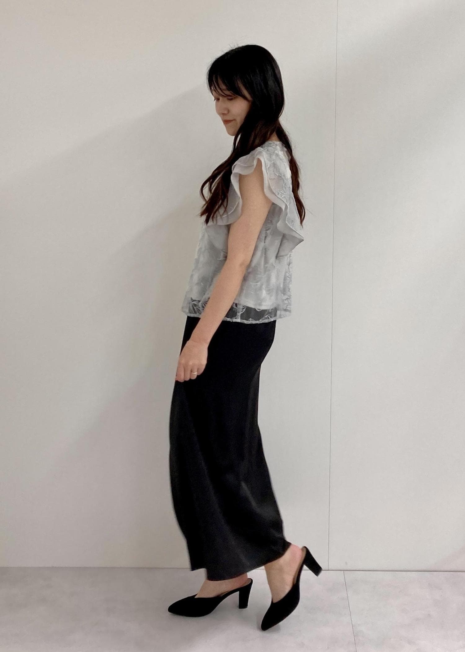 丈感は身長160cmでフルでした。ヒールを履くとほんのり足首がのぞく長すぎない丈感です♪