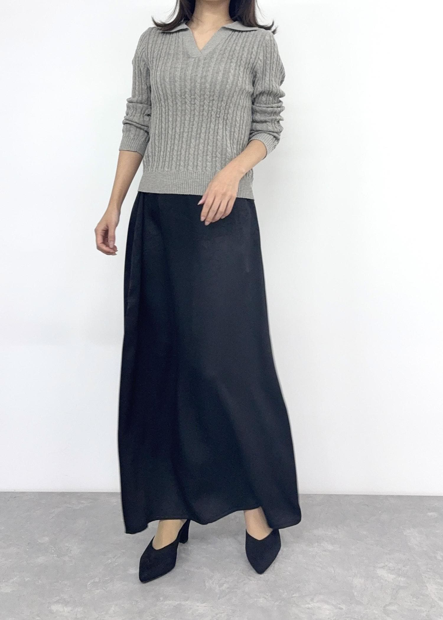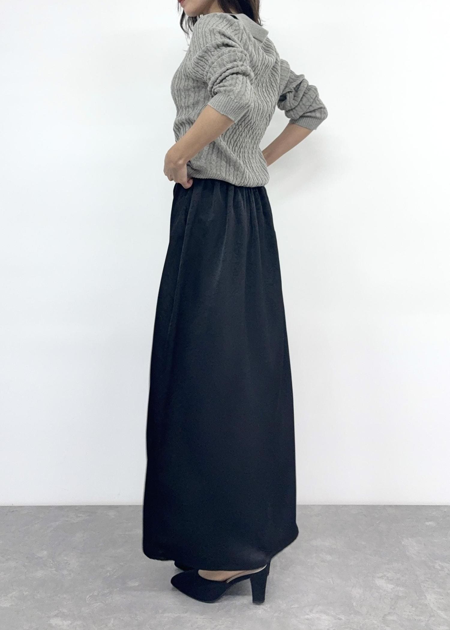スカートは程よい光沢感が上品&華やかな印象。