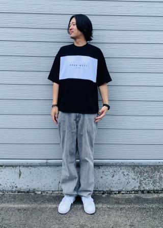 胸に切り替えを入れ、中央にはトレンドのワンポイントプリントを入れています。配色感とルーズなサイズ感で一枚でトレンドコーデが完成します。