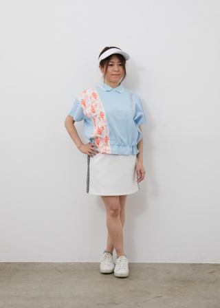 ギャザーを絞る部分にはスイングがしやすい様、裏側にスピンドルコードを付け、ストレスフリーで着用出来る仕様にもこだわったアイテムです。ソフトな肌触りのプレーティング天竺に、バックスタイルの中央部分には、ナバホ柄のメッシュジャガードをコンビ使いにしたスポーティフェミニンな1着です。
