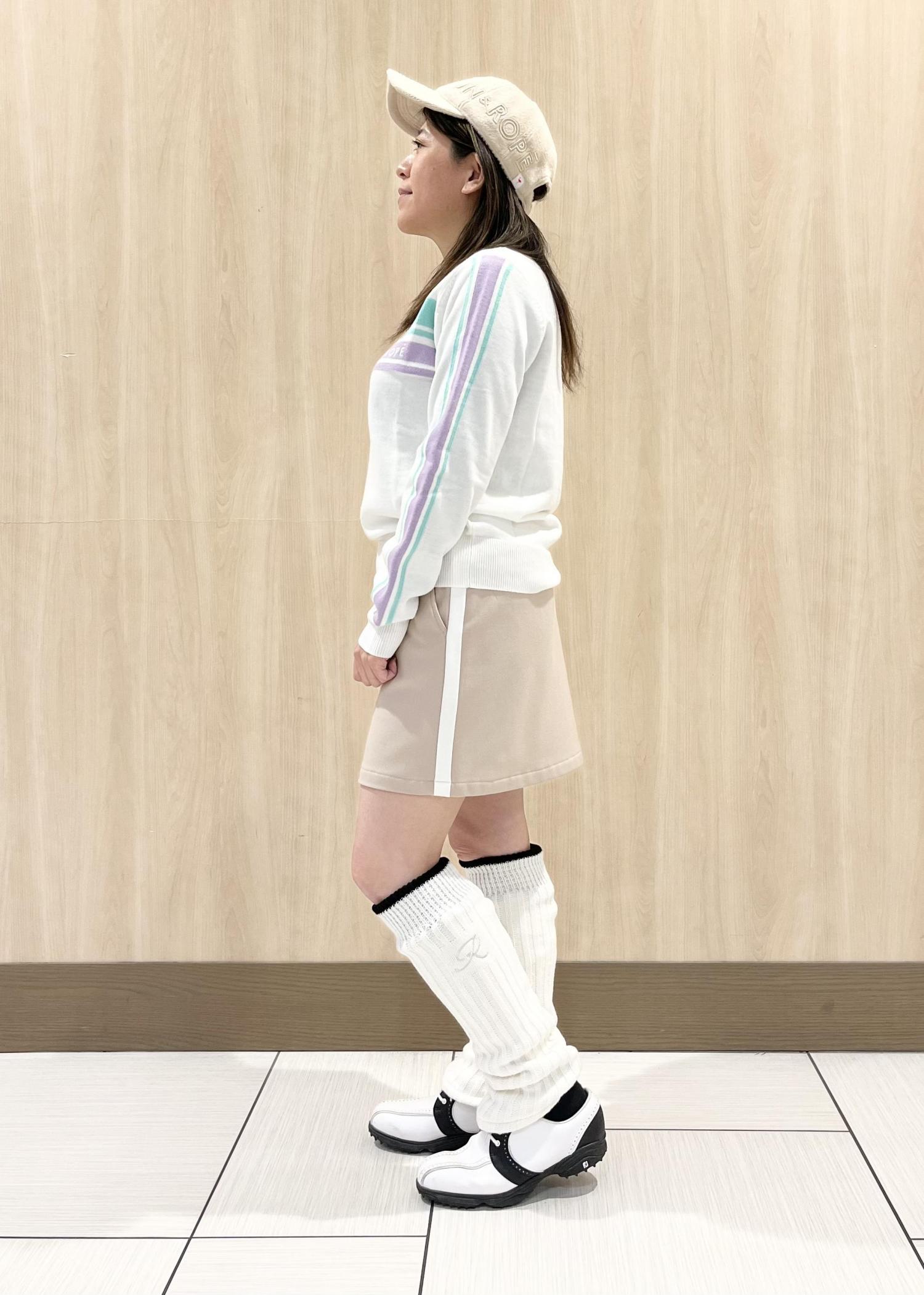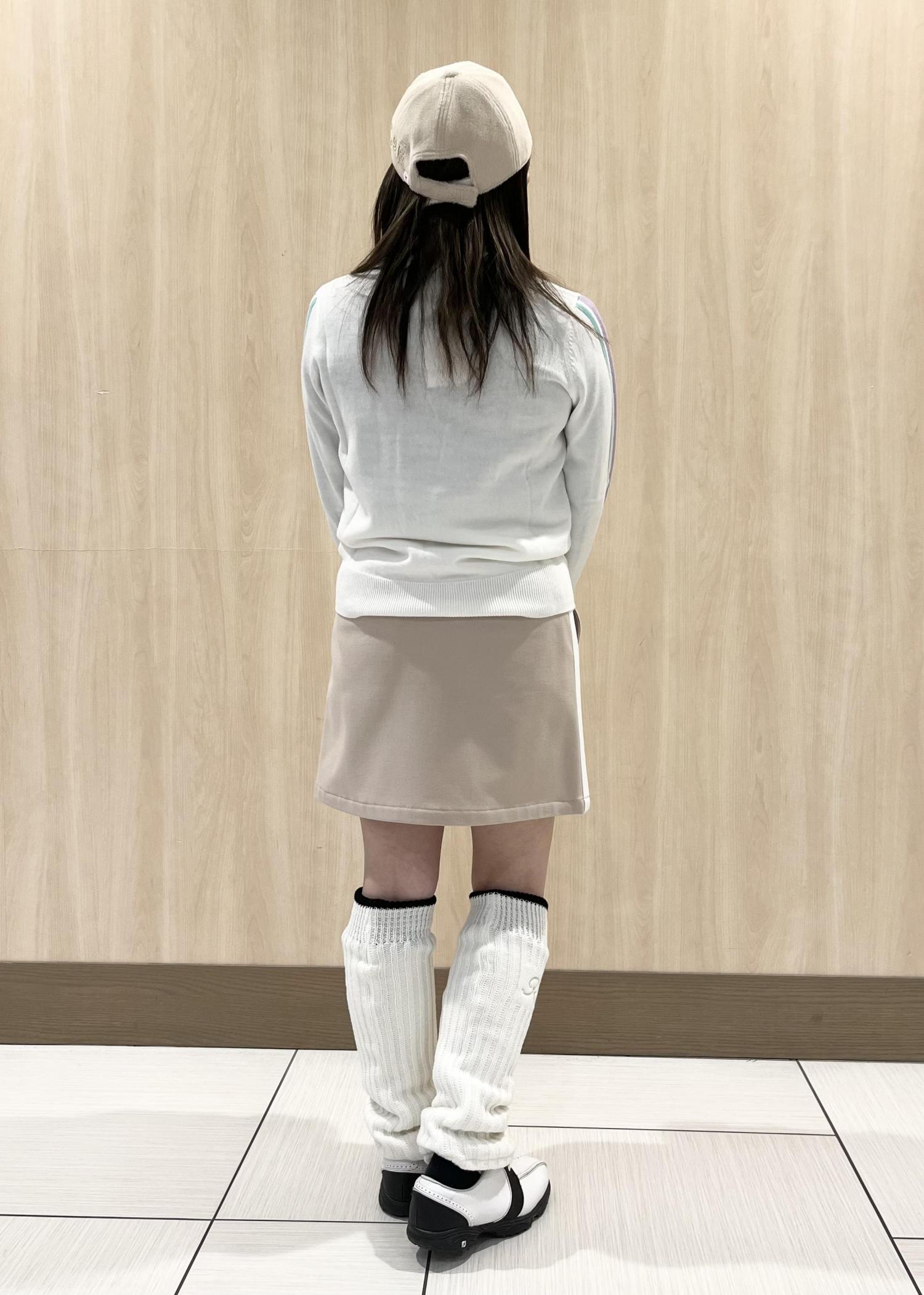 白とベージュを基調として優しい雰囲気にまとめました。春先まで使えるコーディネートです。ニット・スカート共にボリューム感がなくスッキリとしていて体のラインを気にせずに楽に着れるようなシルエットです。