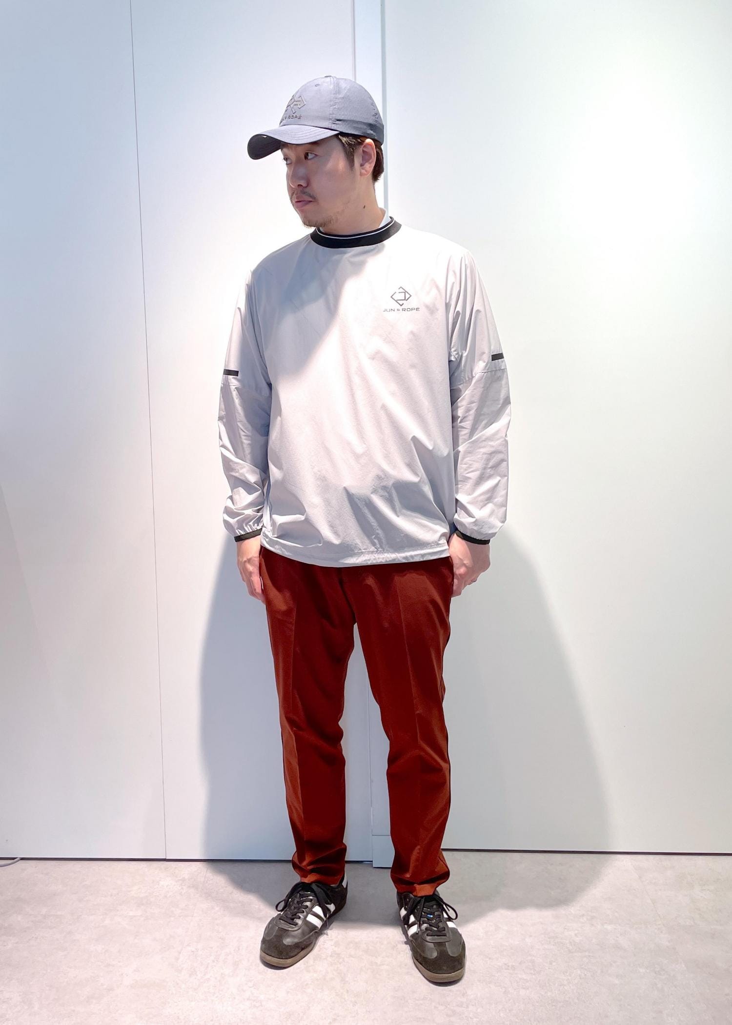 1着持っていると便利なナイロンブルゾンとワインカラーのパンツを合わせたスタイル。ブルゾンは適度な耐水性と透湿性を兼ね備えており、快適なプレイを実現。