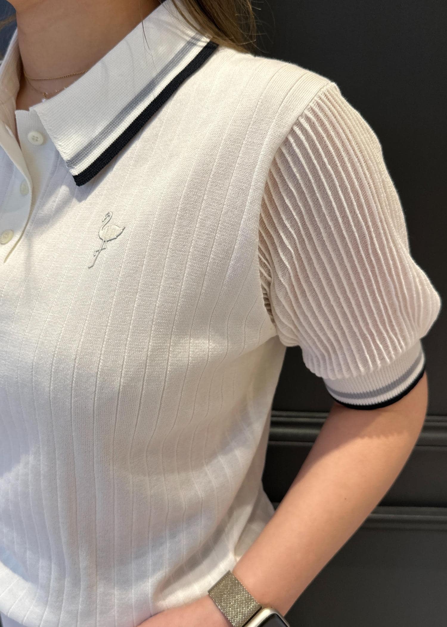 アウトレットJun & Ropé編地コンビ使い5分袖ニットポロホワイト / M¥8,250レビュー衿、袖口、裾のライン配色で上品なデザインに。