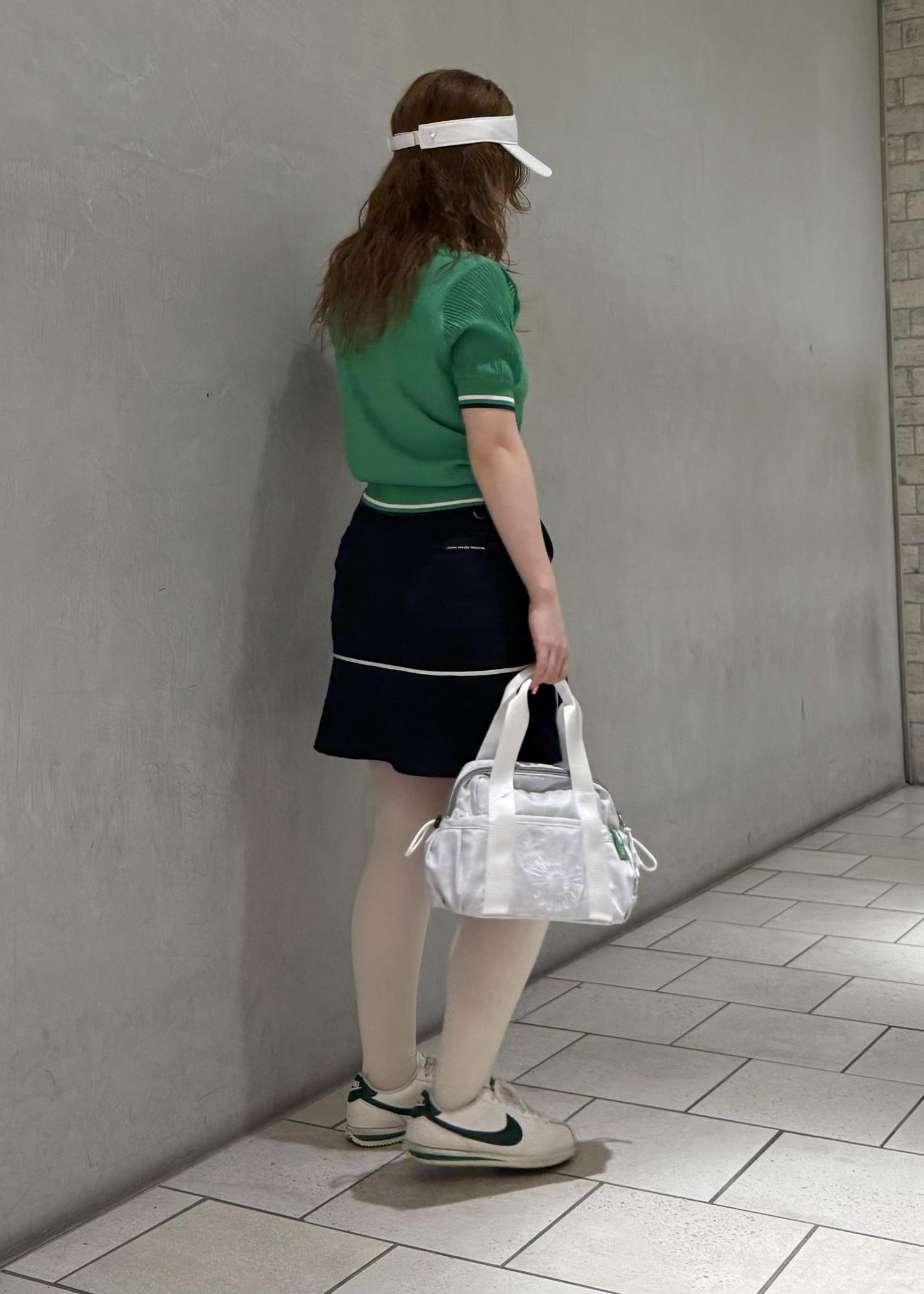 鮮やかなグリーンのニットポロの袖口のラインのネイビーと白を拾って、スカートはネイビー、小物は白でまとめました。