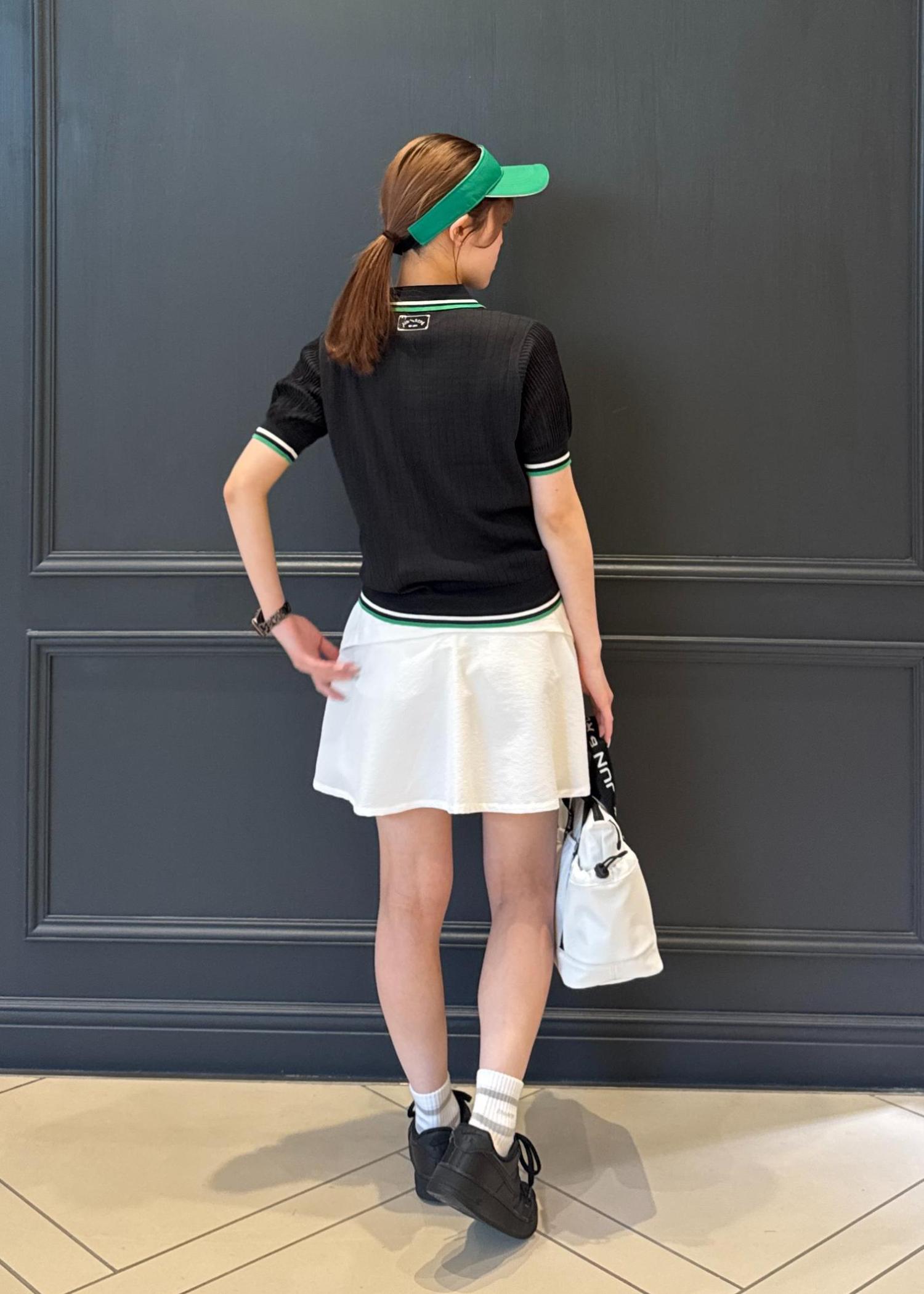 ニットポロはサマーニット素材で着心地も良くスカートとの合わせで女性らしいコーデになります◎