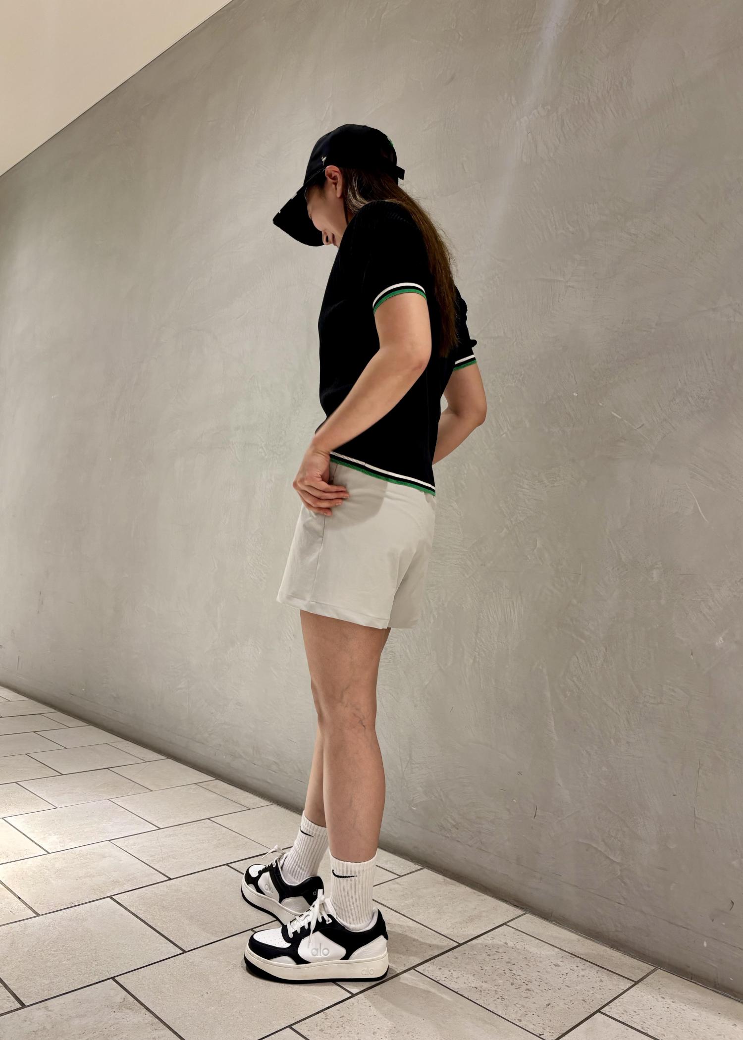 女性らしい印象のニットポロとスタイリッシュなショートパンツで合わせたコーディネートです。