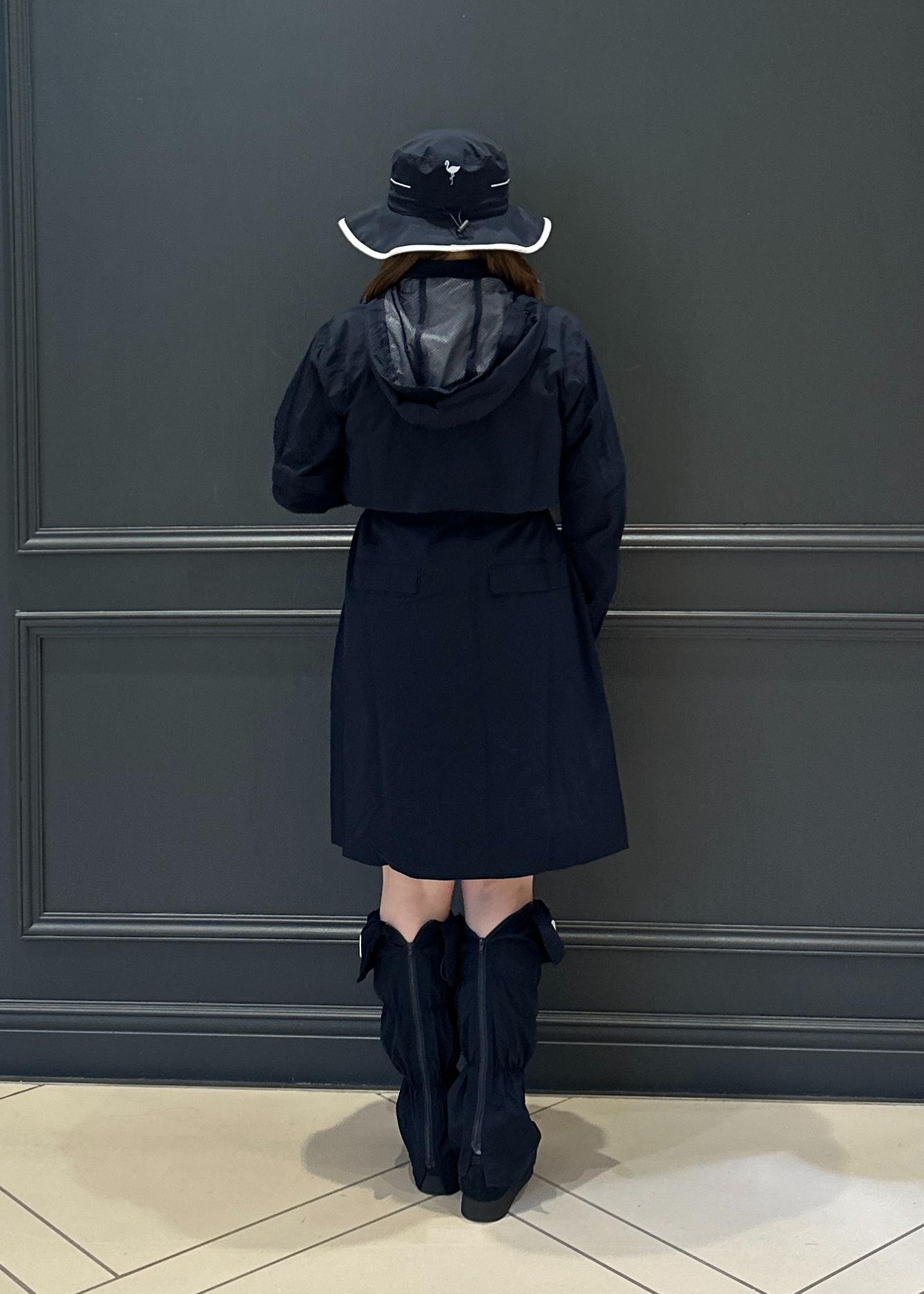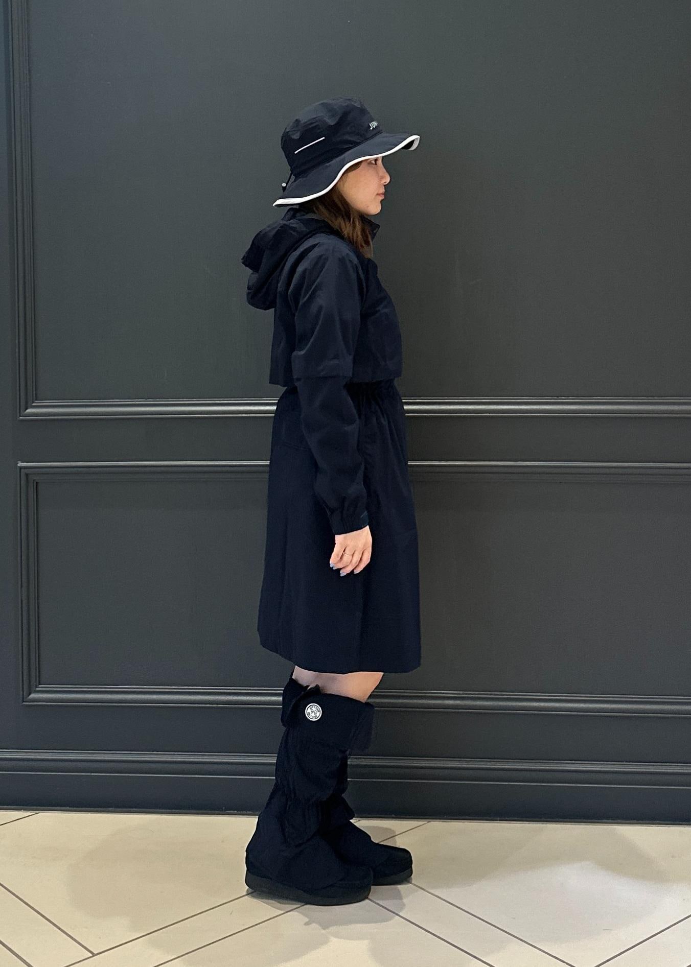 ウエストのドロストを絞ればシルエットにメリハリが出て、レインウェアでもスタイル良く見せてくれます♪