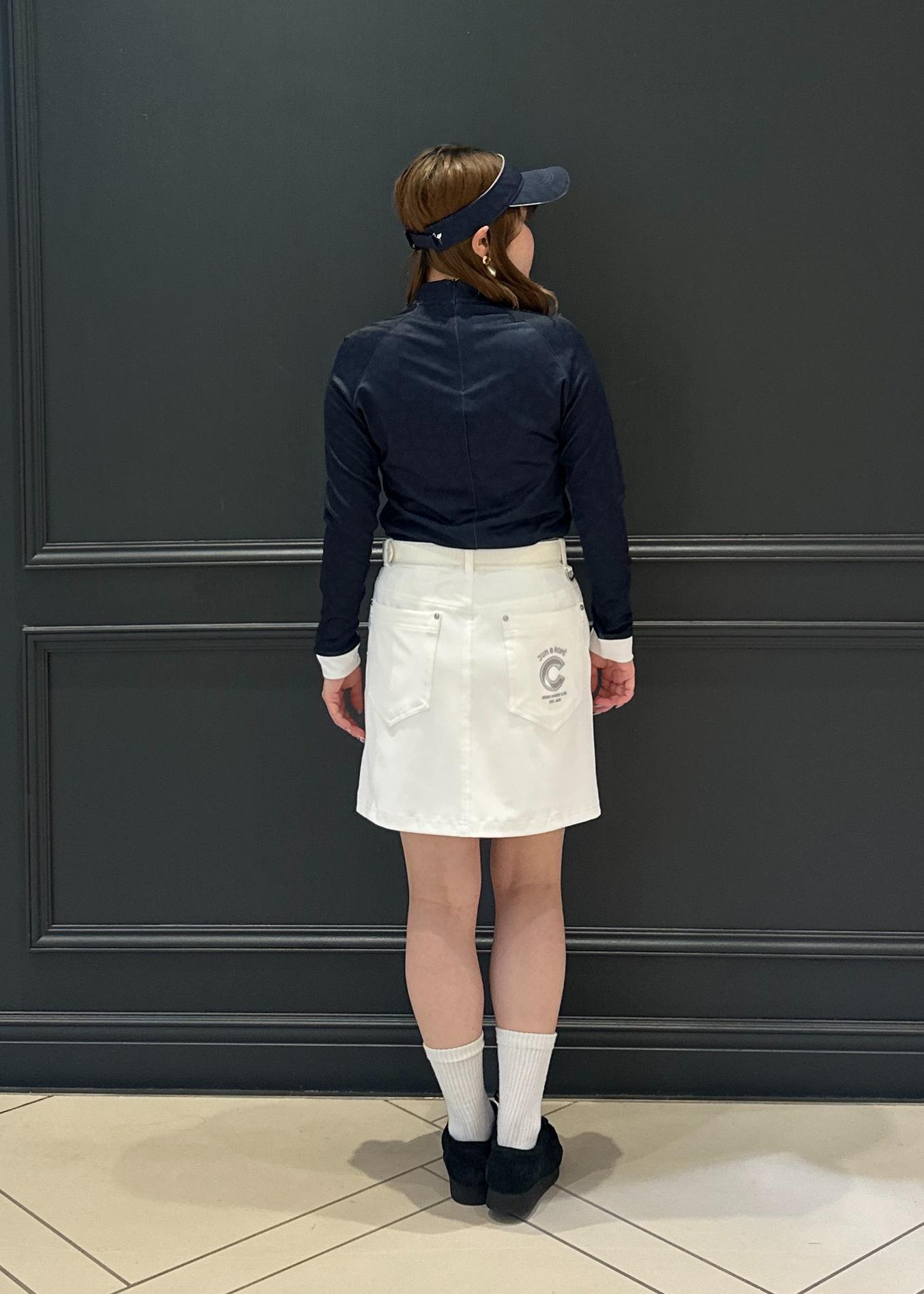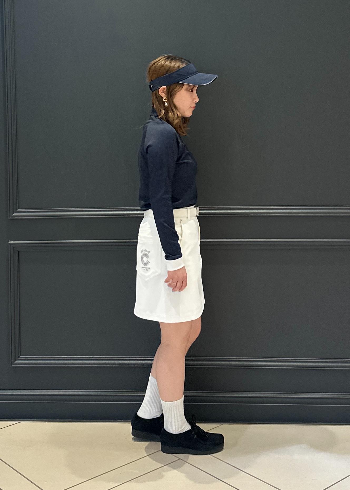 すっきりとした白のスカートを合わせることで、全体の印象がクリーンにまとまり、上品さも引き立つスタイリングに。