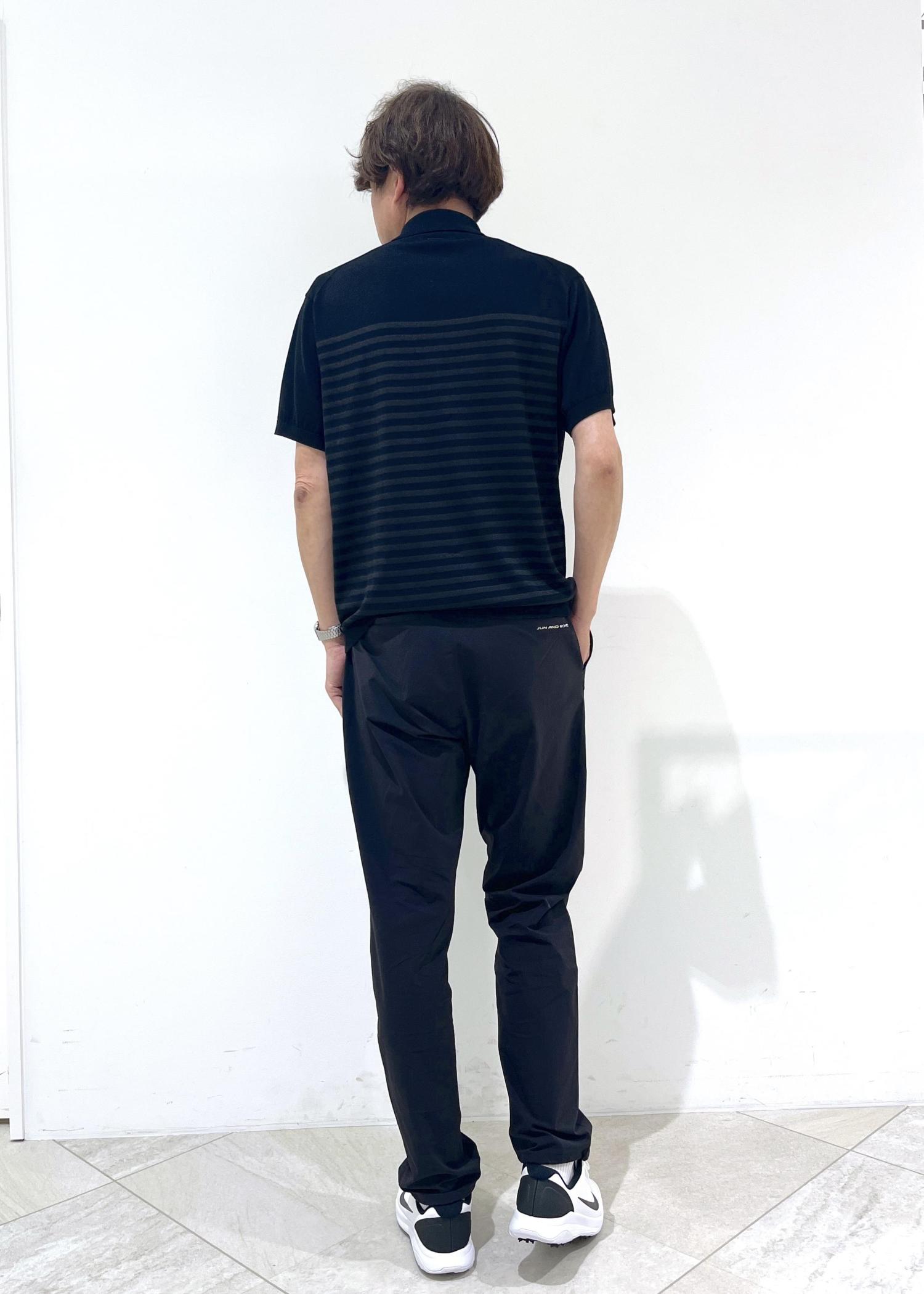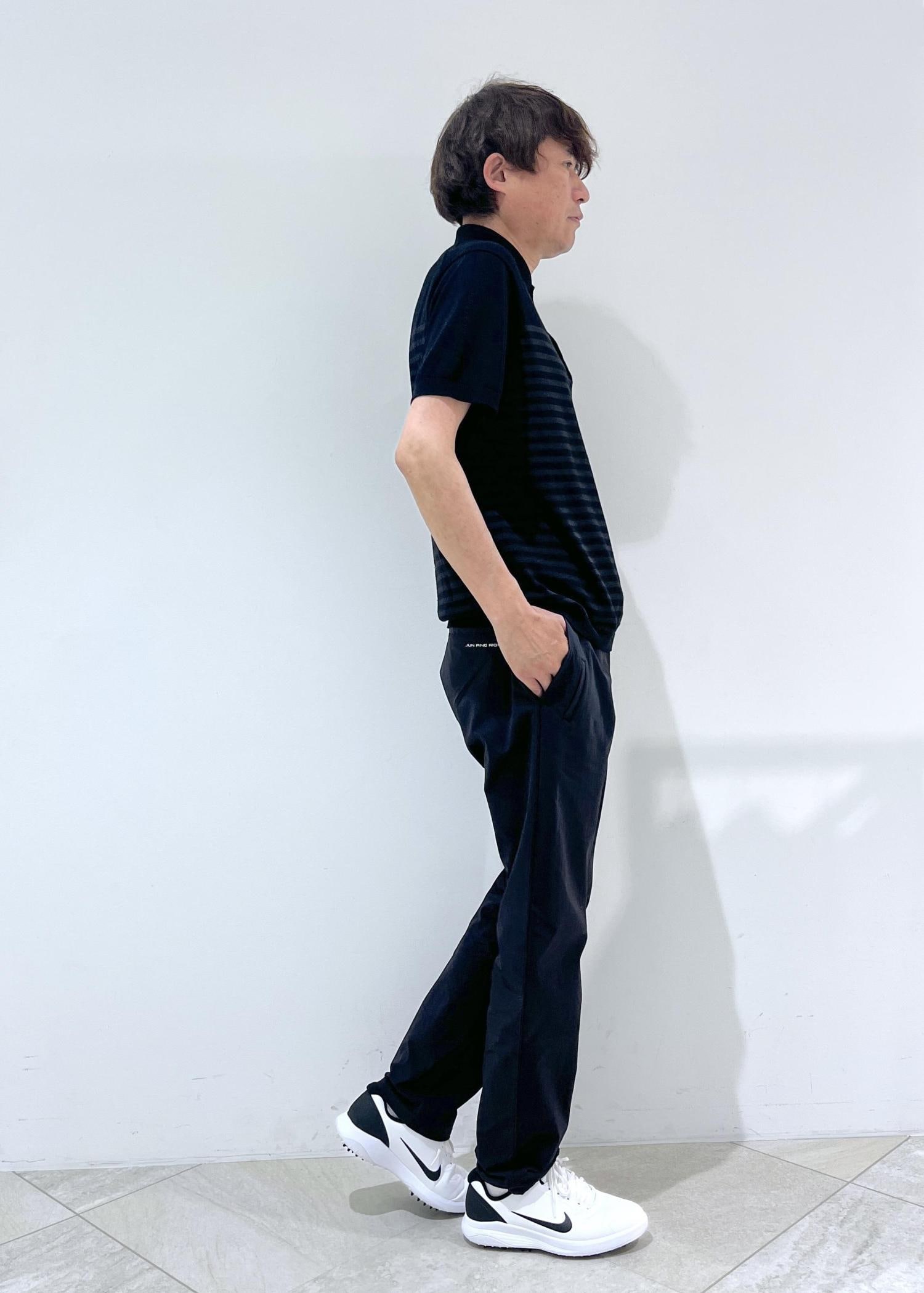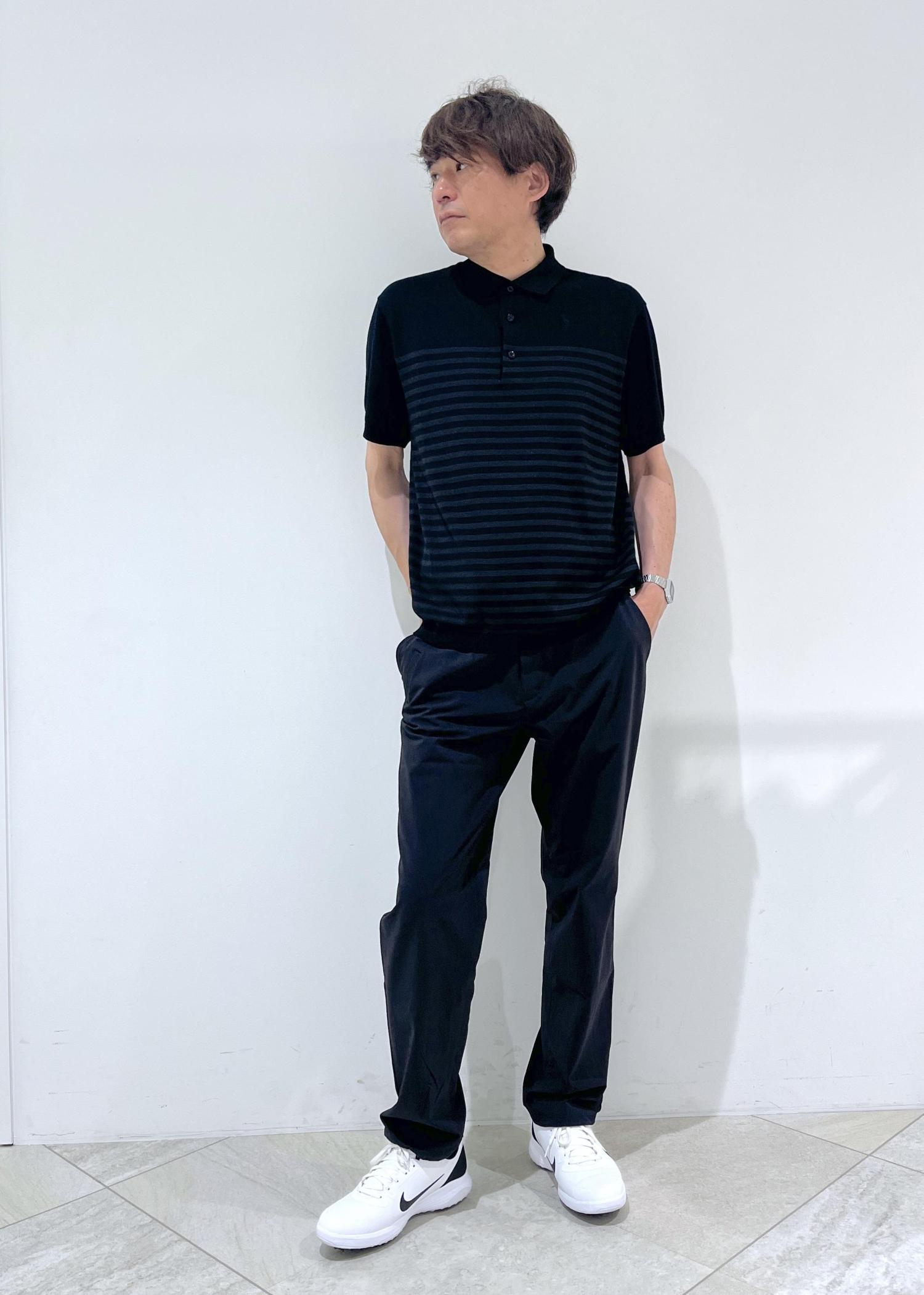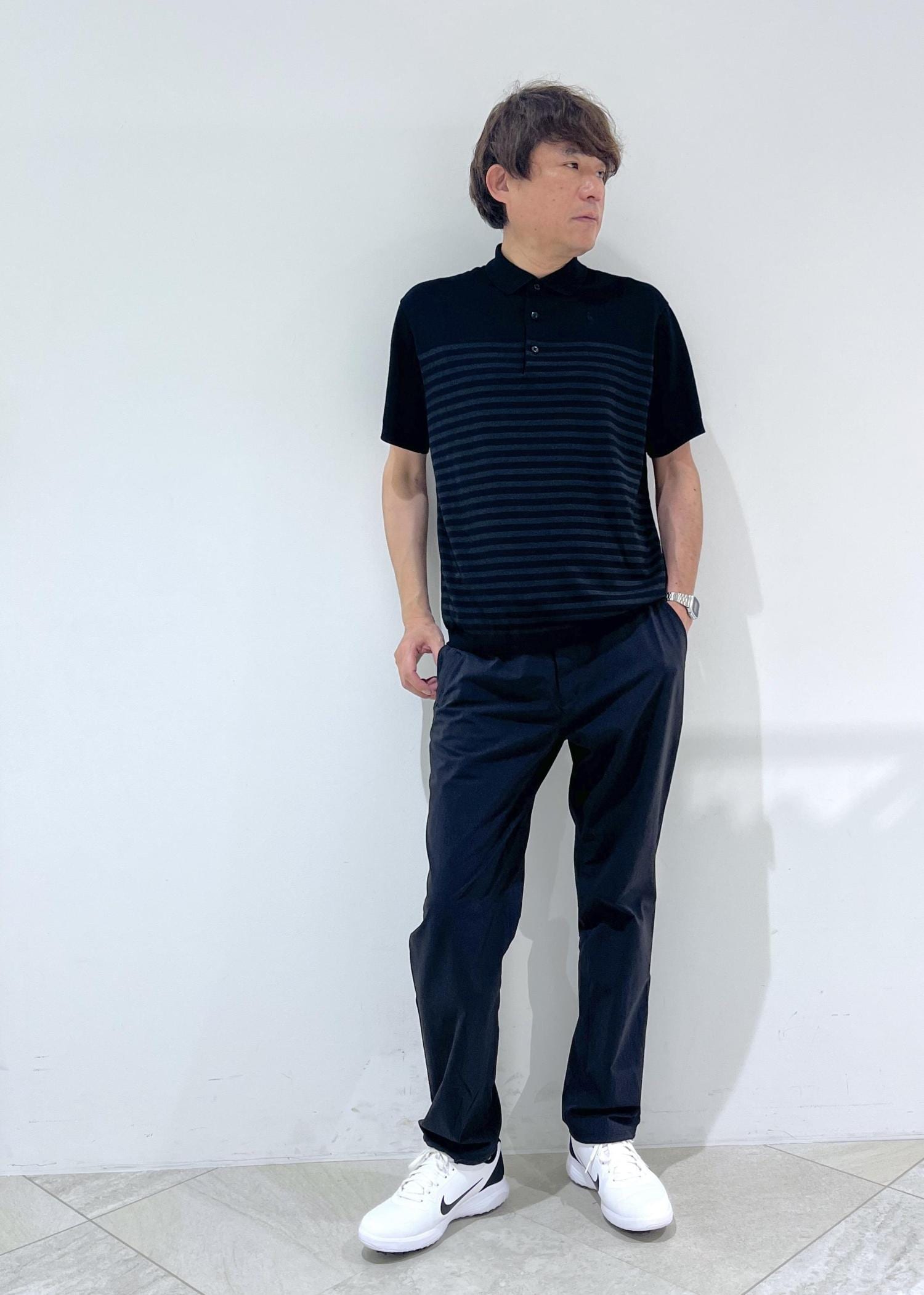 ジョガーパンツを合わせたアフターゴルフスタイル。