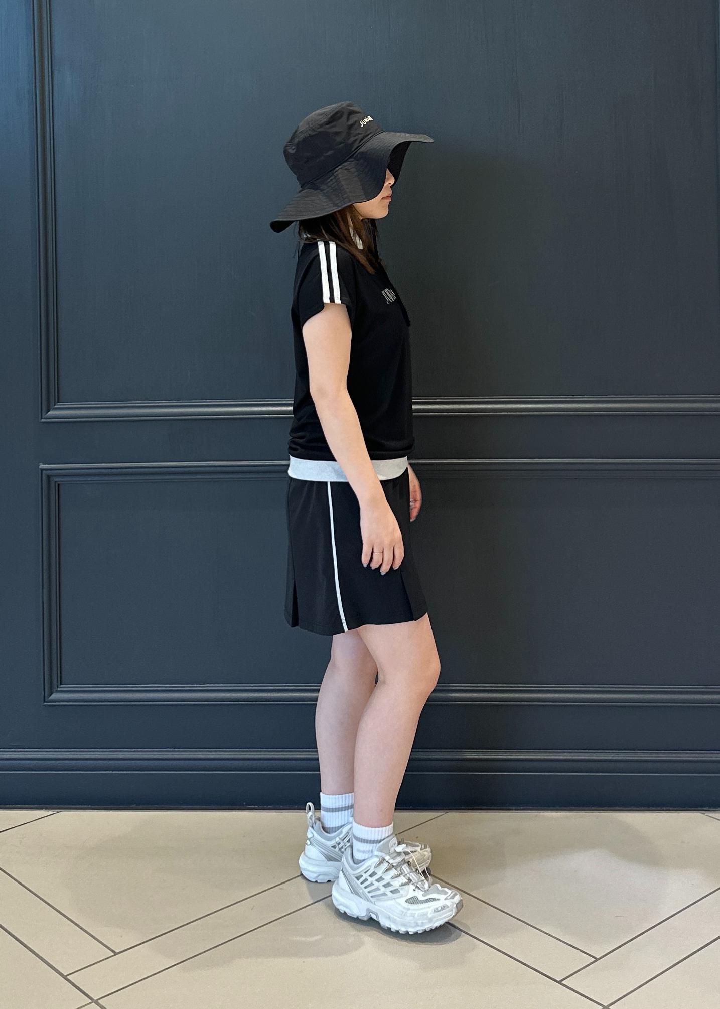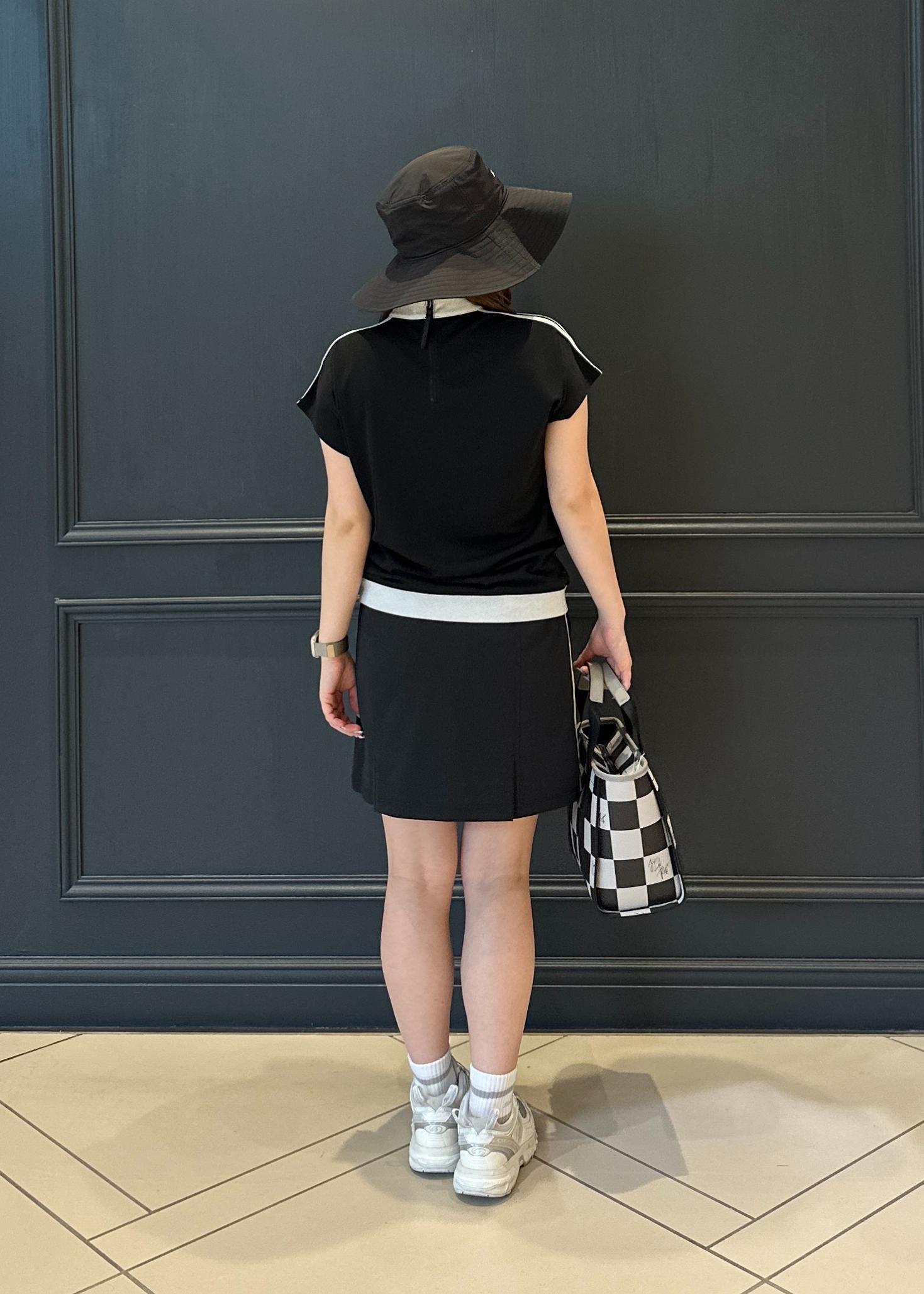 サイドの配色ラインがアクセントになりつつ、裾のタックデザインで女性らしさをプラス。
