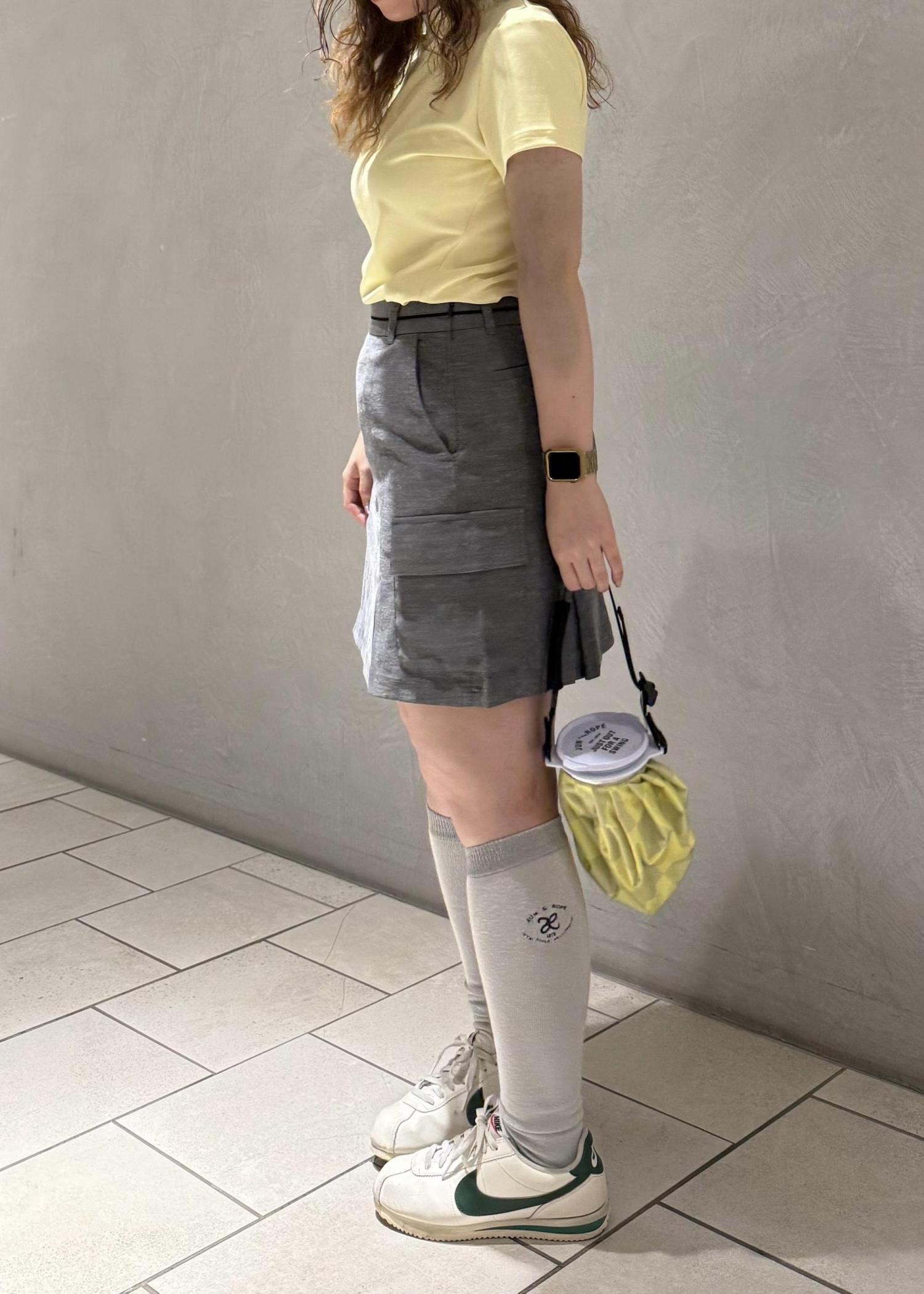 メインのパステルイエローのポップでかわいい印象を他のアイテムをグレーカラーでまとめる事により上品で大人かわいいスタイルにしました。