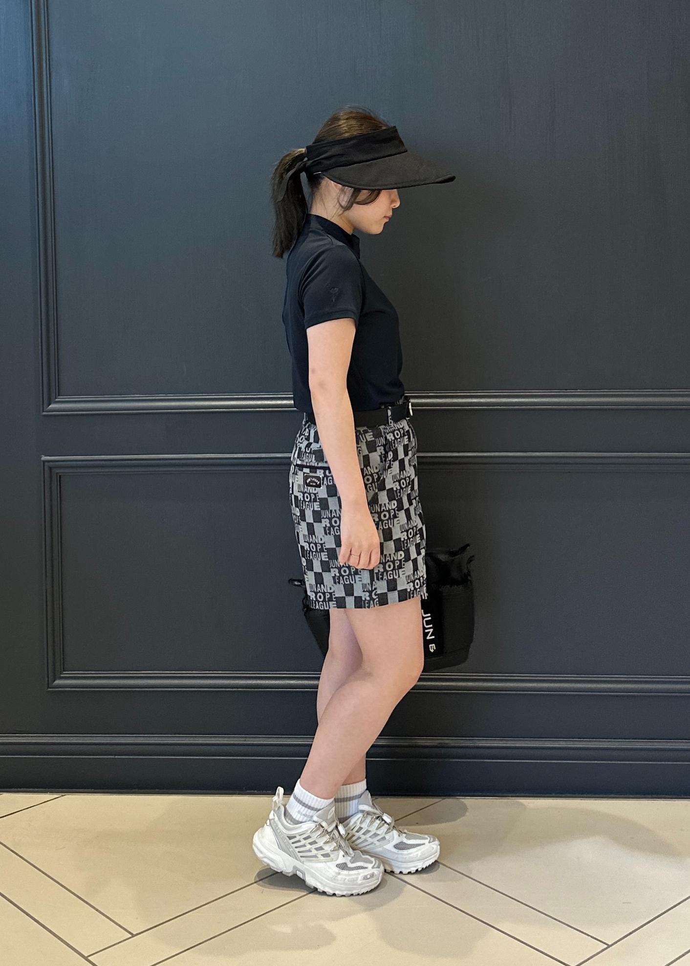 シンプルなブラックのトップスに、存在感のある総柄ショートパンツを合わせて、モノトーンでまとめたクールな印象のスタイルに♪