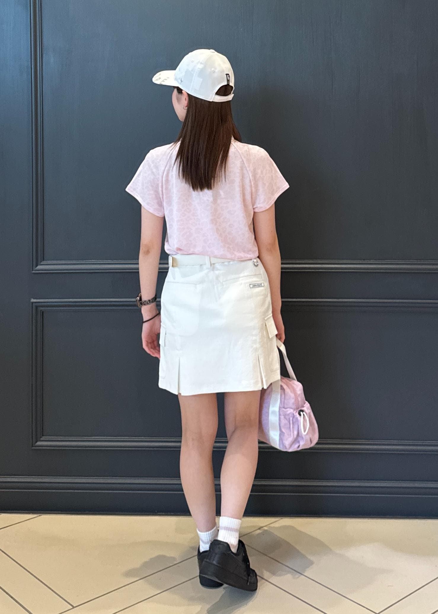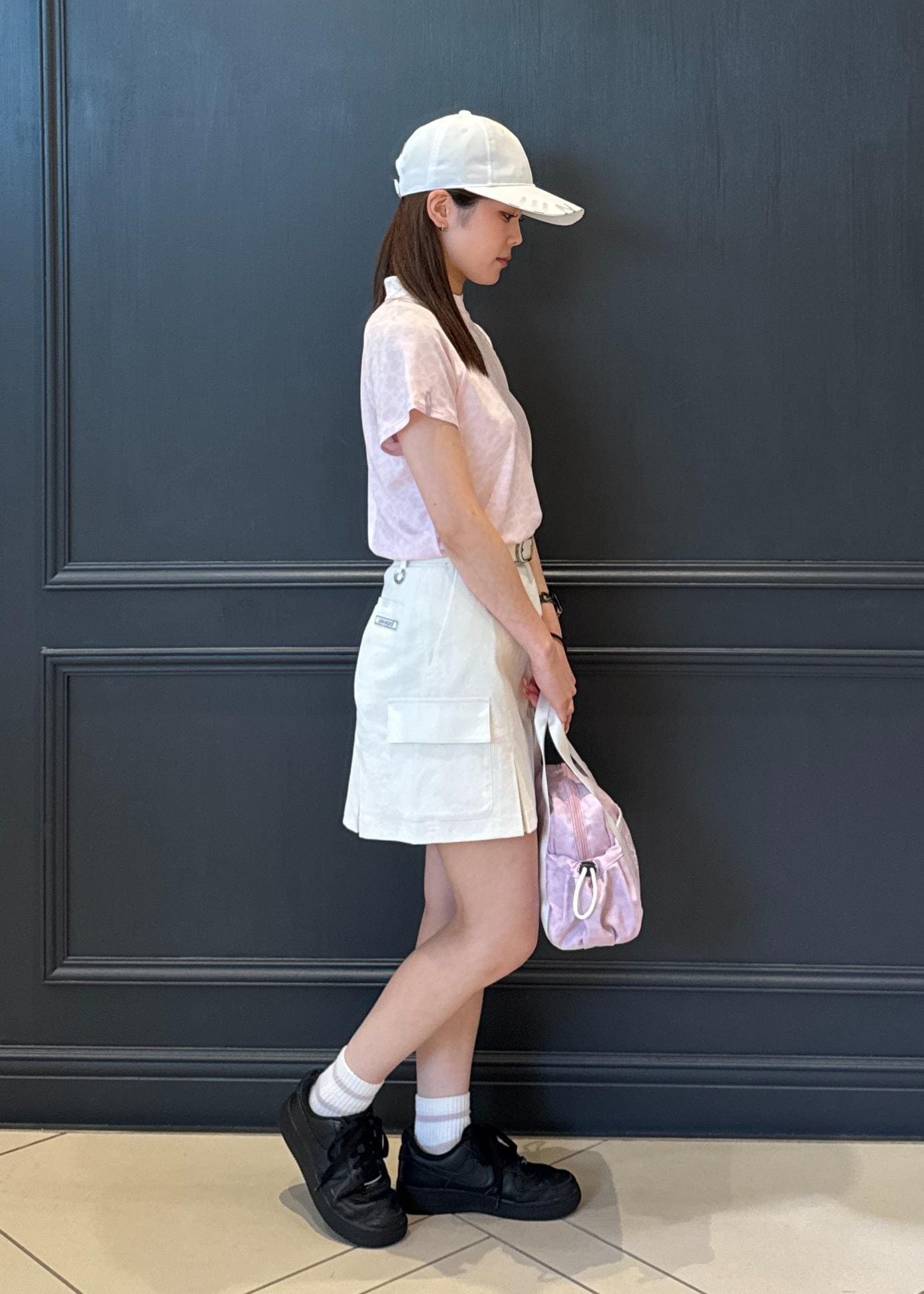 トップスは可愛らしいパステルピンクカラーなのでスカートはシルエットにカジュアルさがあるアイテムで合わせました◎