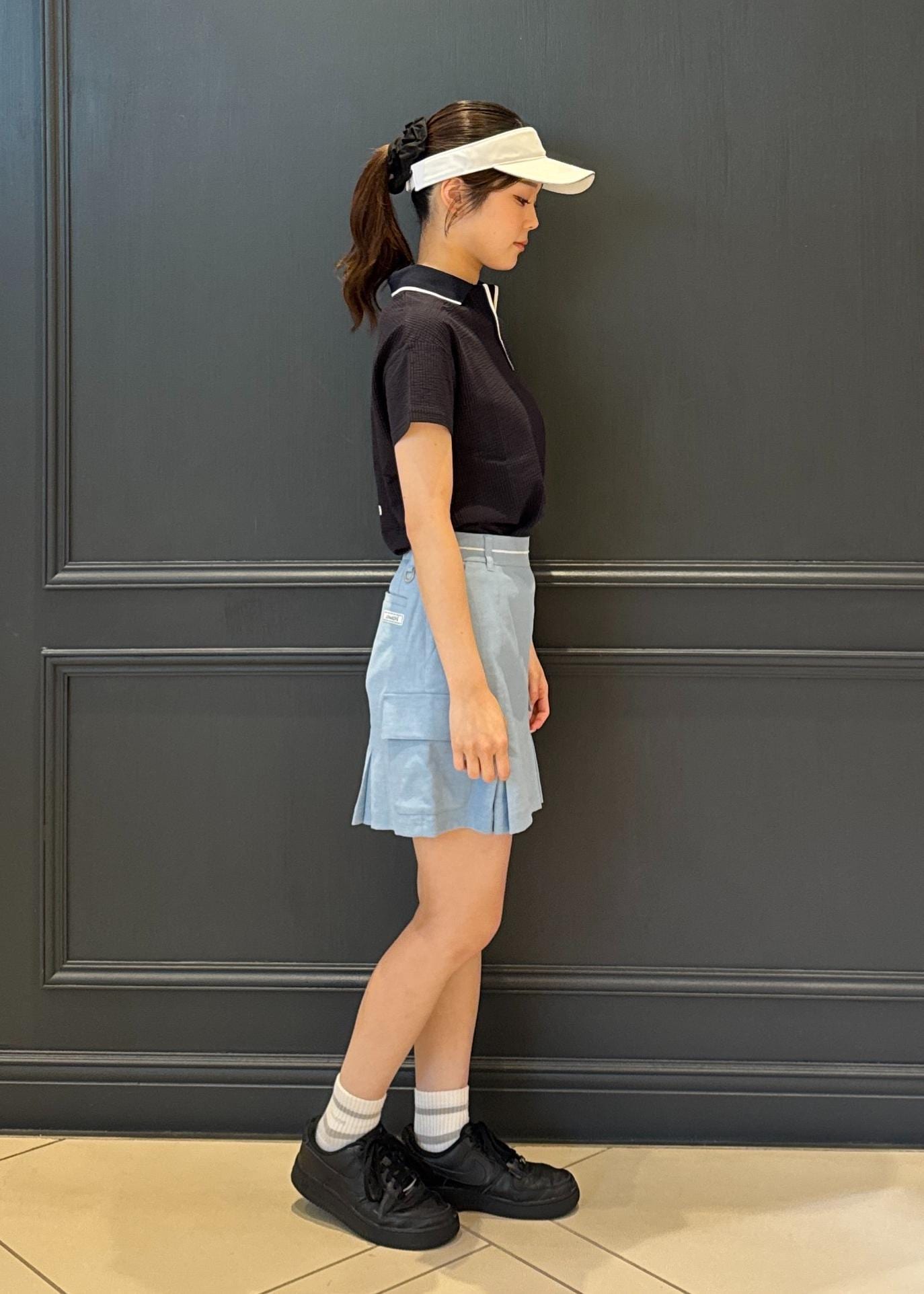 シアサッカー素材なのでさらっとしていて衿元がスキッパーポロになっているので抜け感があって女性らしいシルエットです♪ -