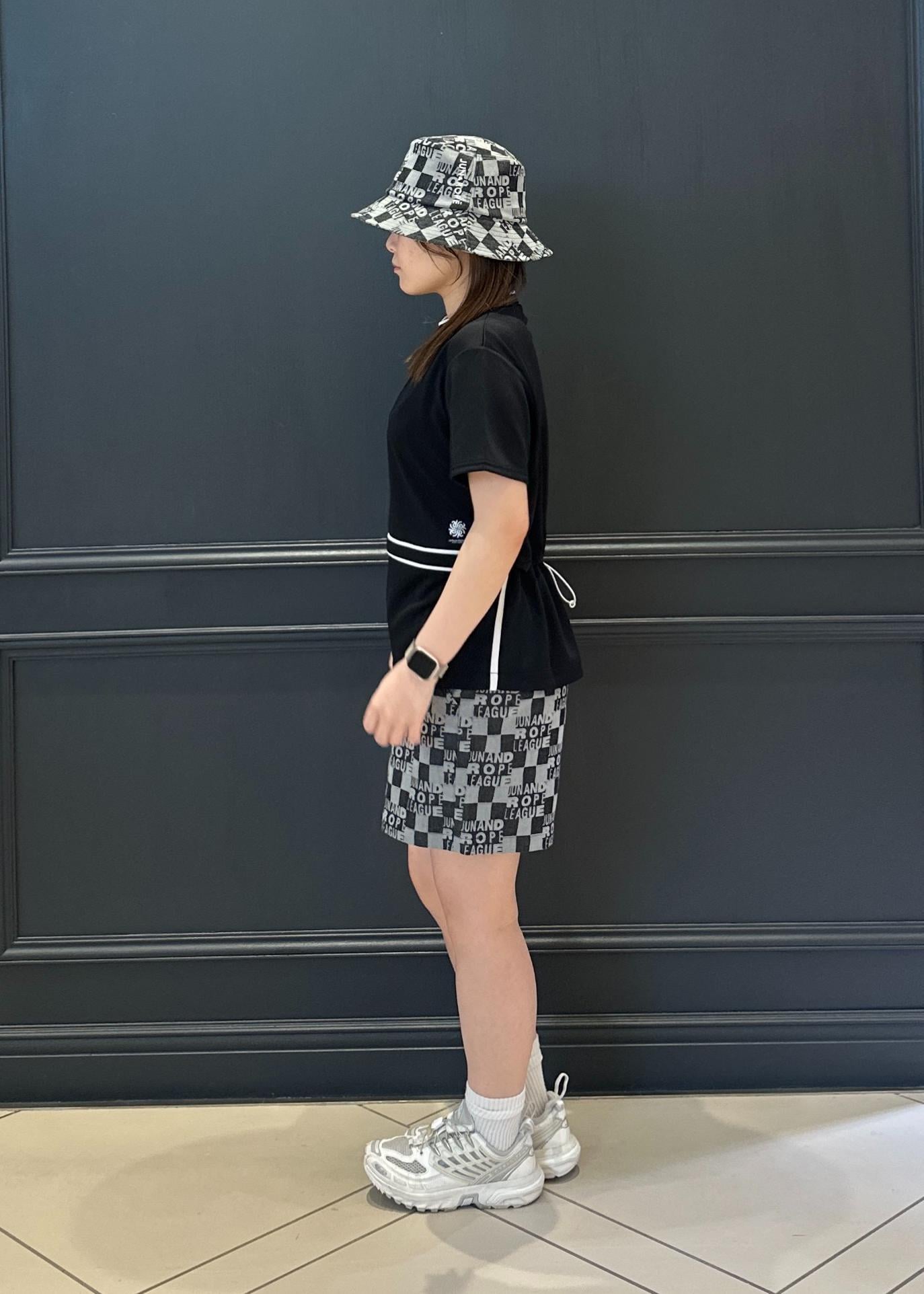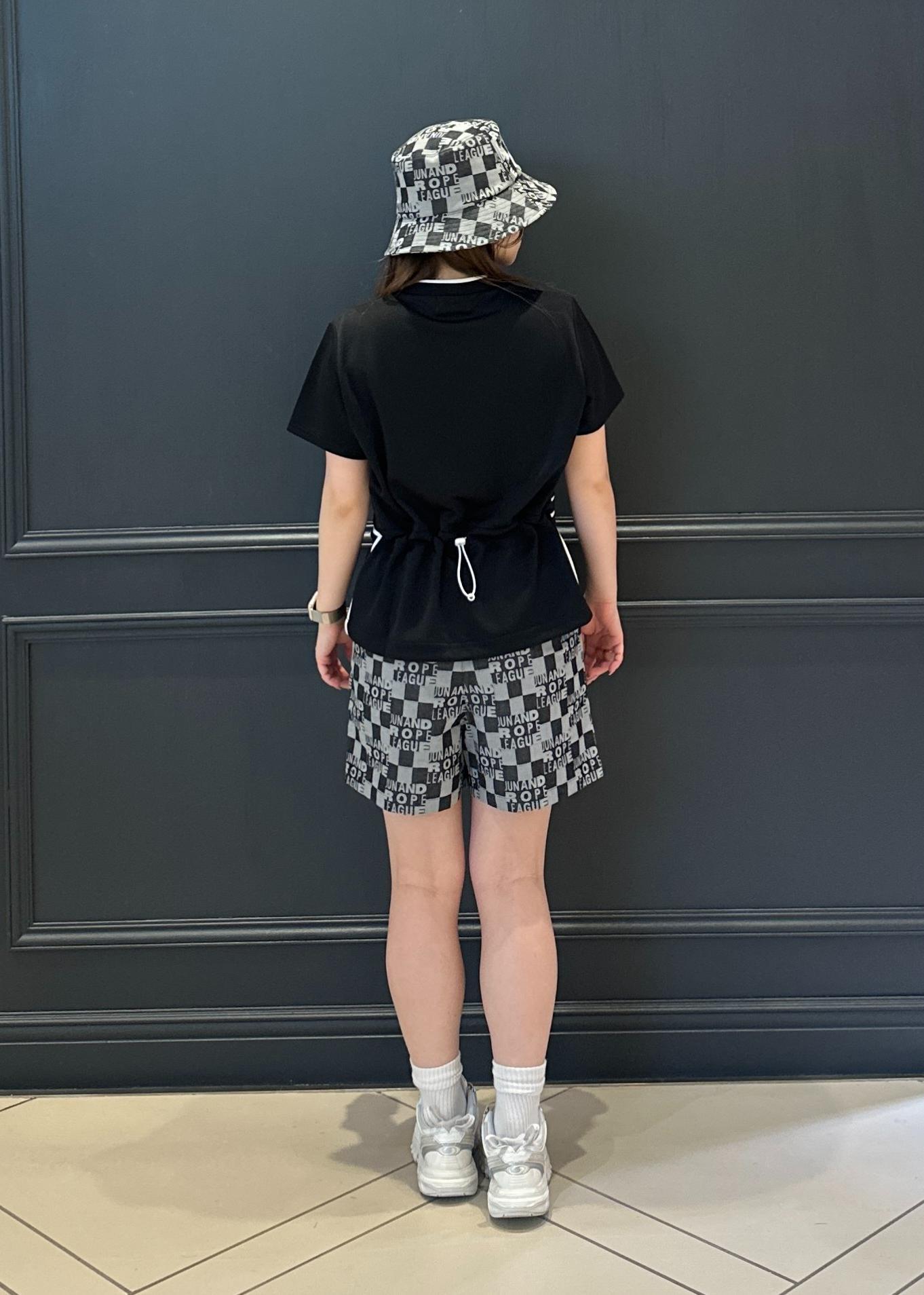 本来はセットアップ対応のアイテムですが、今回はチェッカーボード柄のショートパンツを合わせて、遊び心あるモノトーンコーデに仕上げました。