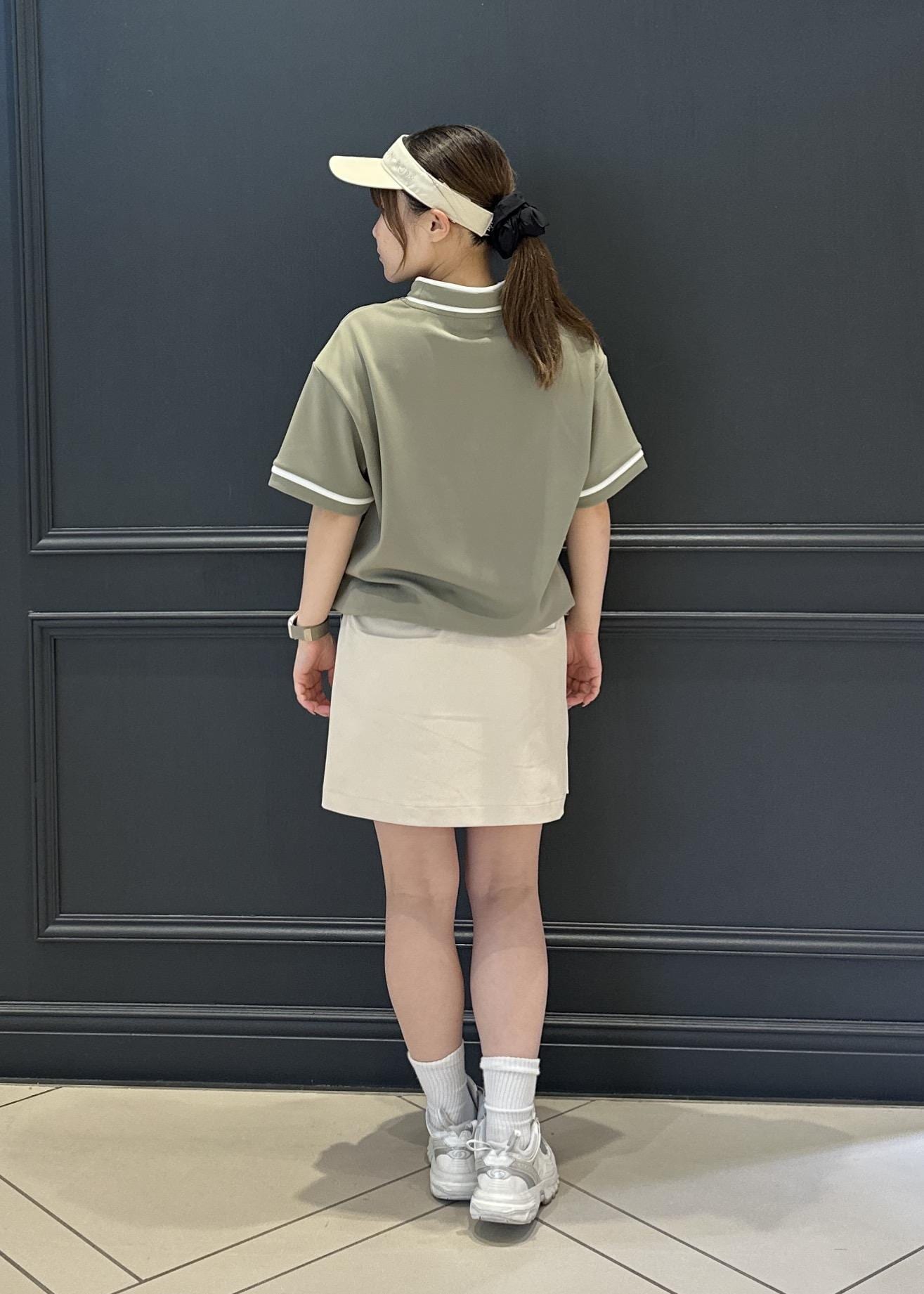 衿元のロゴが映えるトップスに、ベージュ系のスカートを合わせたコーディネート。